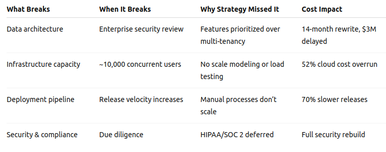 They fail because critical engineering decisions are postponed until growth, compliance, or enterprise sales expose structural gaps.